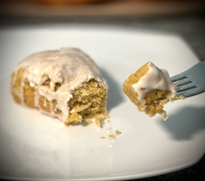 I just use the back of a spoon to spread out the plain glaze layer. If you have your scones directly on your cooling rack I recommend sticking a piece of parchment or foil under the scones before frosting. Frosting the scones (especially if the kids are helping) can get a little messy. For the spice glaze, I pour the glaze into a sandwich bag stretched over the opening of a glass. You then cut a small hole in the corner of the bag and drizzle the spiced gaze on top of the plain glaze layer.